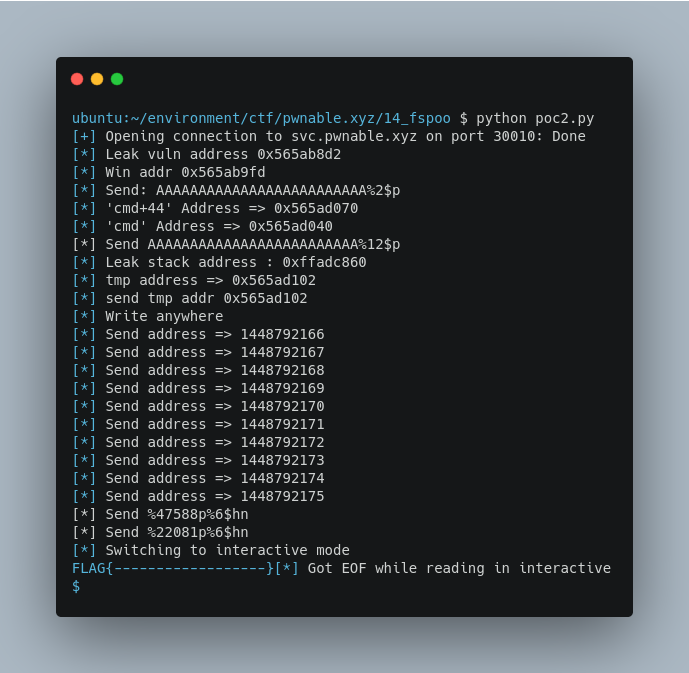 ubuntu:~/environment/ctf/pwnable.xyz/14_fspoo $ python test.py