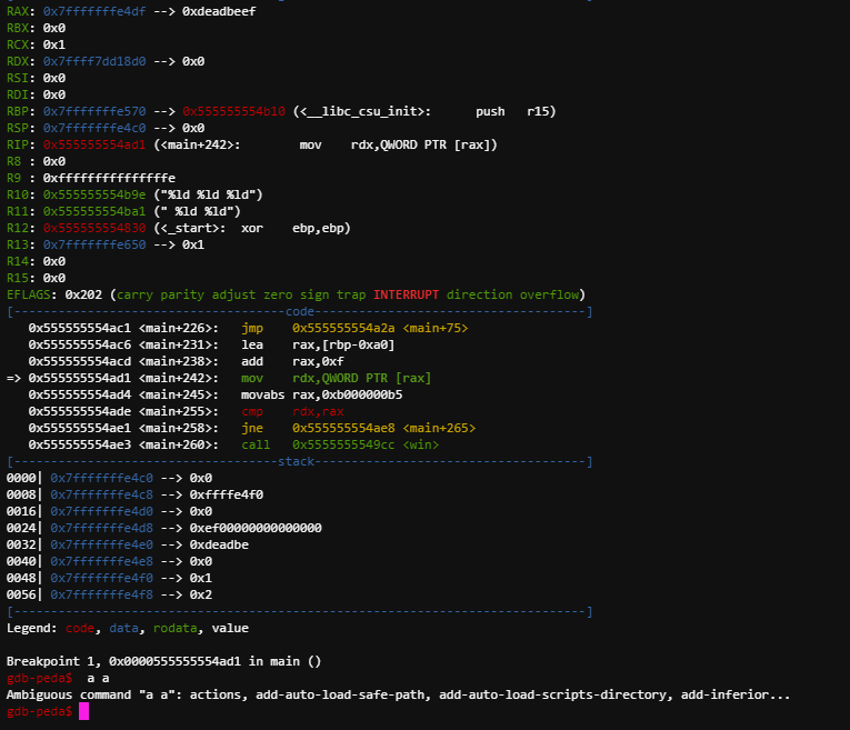 그렇다면, Arbitrary overwrite 취약점으로 (rbp-0xa0) + 0xf 주소에 있는 값을 0xb000000b5 으로 overwrite 한다면 문제가 풀리게 된다.