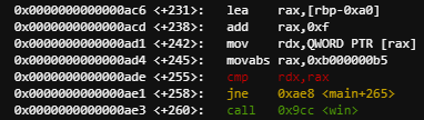 rax에 &((rbp-0xa0) + 0xf ) 주소를 넣고
