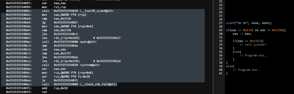 scanf로 두개의 인자를 받고 위 코드 흐름대로 조건에 맞게 된다면, system 함수가 실행이 된다.