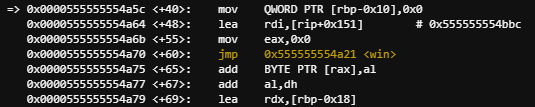 만약 main+60 명령어를 변조하여 win 함수를 호출하는 명령어로 변조하면 win 함수가 실행될 것이다.