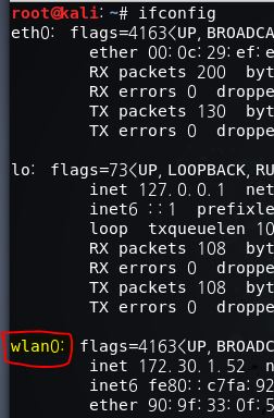 가상머신에서 동작중인 kali에 외장 랜 카드를 인식하게끔 하고 ifconfig 명령어를 입력하여 인터페이스 이름을 알아낸다.