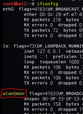 아래 사진처럼 ifconfig 를 입력하면 wlan0 => wlan0mon으로 바뀐것을 확인 할 수 있다.
