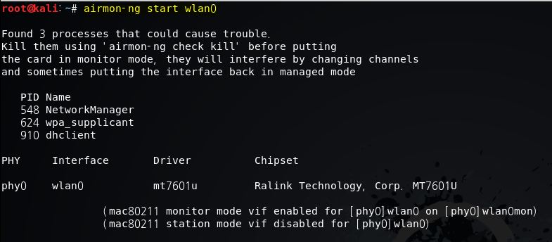 위에 처럼 확인을 했으면 재부팅을 하고 airmon으로 monitor mode를 활성화 시켜 보겠다.