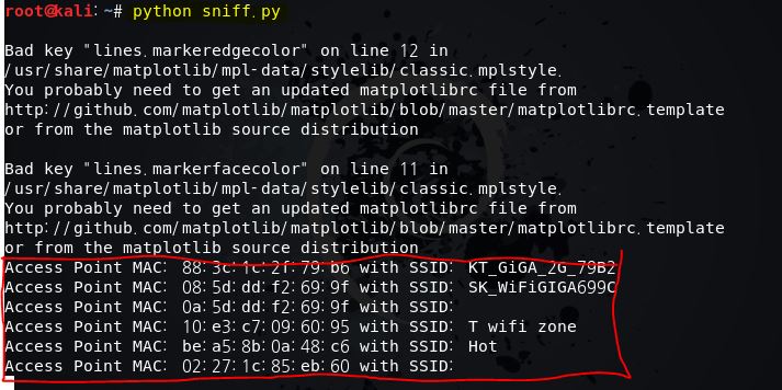 위 코드를 실행해보면 아래 사진 처럼 실시간으로 주변의 AP 기기들의 SSID와 MAC 주소를 얻을 수 있다.