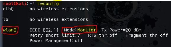 iwconfig 명령어를 입력했을때 wlan0(필자와 다른 이름일 수 도 있다.) 인터페이스가 monitor 모드로 바뀐 것을 확인 할 수 있다. 아래 사진처럼 출력될 경우 monitor mode를 사용할 수 있다는 뜻이다. 확인을 했으니 재부팅을 해주자.