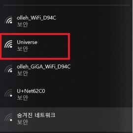 와이파이 목록을 확인 해보면 Universe 라는 아무런 기능이 없는 AP가 뜨는 것을 확인 할 수 있다.